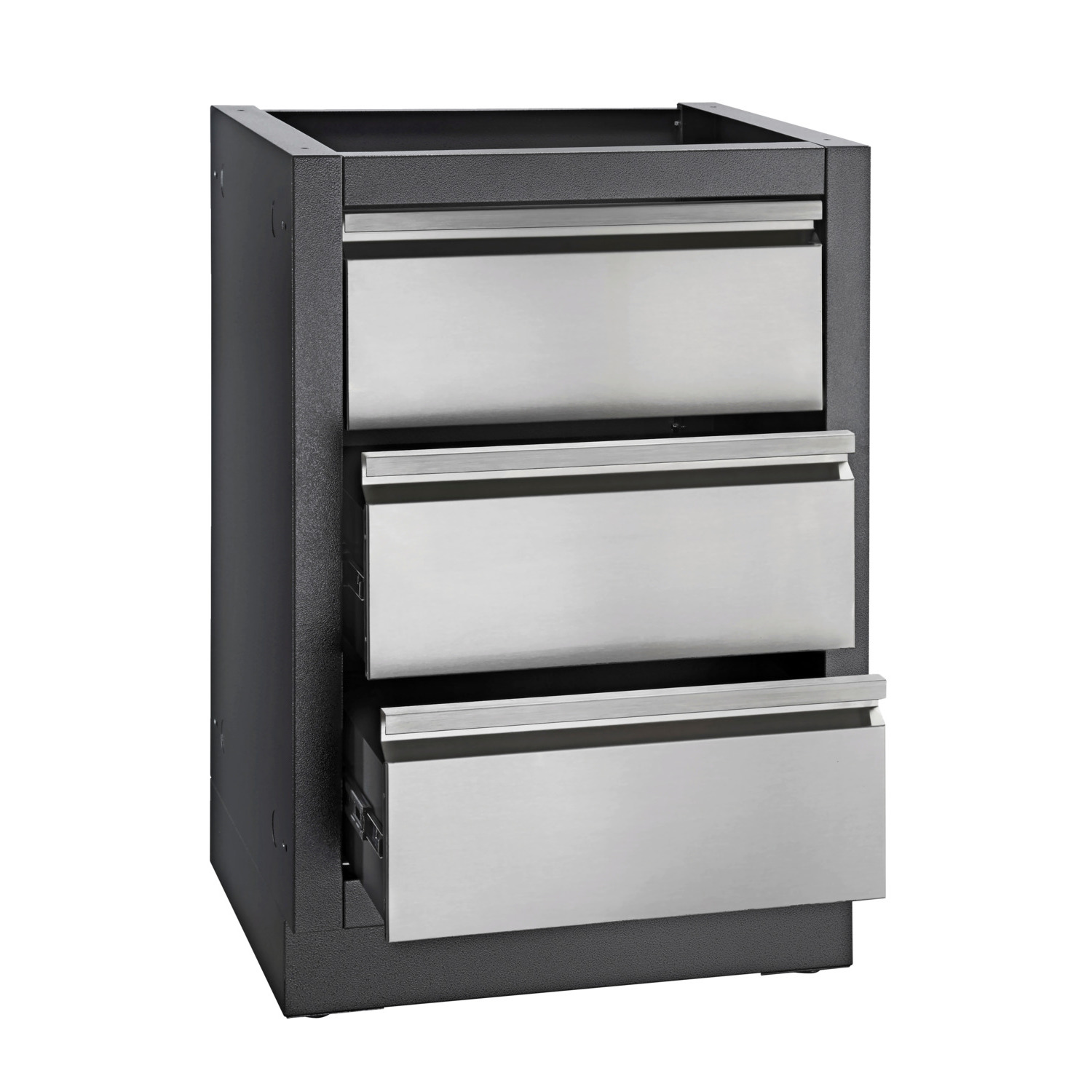Dette OASIS™-skuffemodul har to store skuffer og en falsk skuffe øverst, som gør det muligt at installere en lille håndvask eller en drop-in sidebrænder. Modulet har justerbare fødder, så det kan stå lige selv på ujævnt underlag. Ovenpå modulet er der plads til en bordplade, som skal købes særskilt.