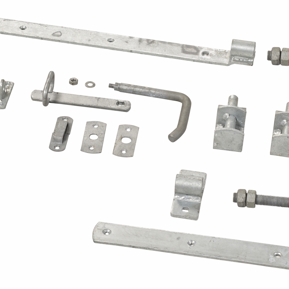 Dørbeslaget i varmgalvaniseret stål leveres i et komplet sæt, så du har alt, hvad du skal bruge til at få monteret døren på dit skur, redskabsrum, havehus eller lignende.