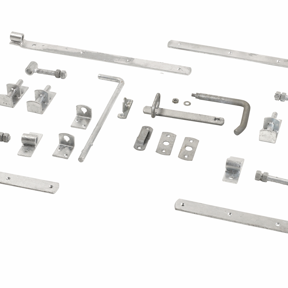 Sættet indeholder styrkeberegnede dørbeslag, justerbare stabler, stalddørsgreb og alle de nødvendige bolte/skruer. De justerbare stabler gør det muligt at rette dørene, hvis de kommer til at hænge.