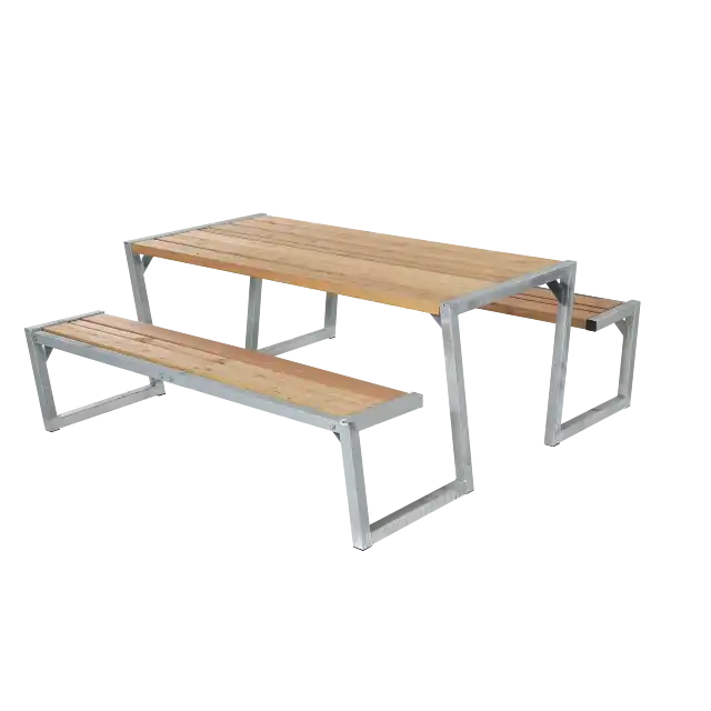 Bord-/bænkesættet i ThermoWood® går under navnet Zigma, som er inspireret af de bærende stålbens zigzag-form. De skæve linjer giver sættet et let og dynamisk udtryk, som passer til den moderne livsstil.