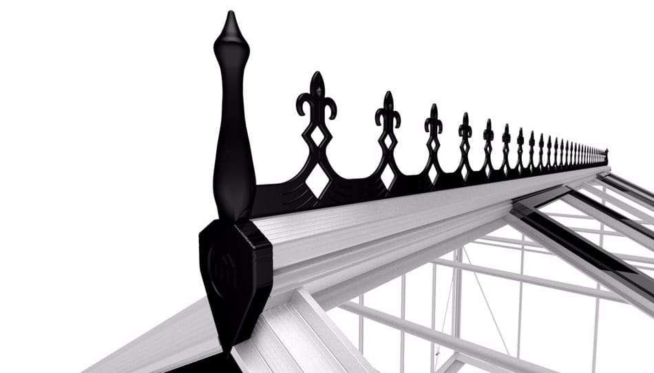 Tagudsmykning - også kendt som cresting - blev oprindeligt udviklet for at undgå at fuglene satte sig på tagryggen. Det giver samtidig drivhuset et klassisk romantisk udseende. Om der skal tagudsmykning på dit drivhus, er op til dig. I Juliana sortimentet kan der tilkøbes tagudsmykning til Compact, Premium, Gartner og Orangeri.