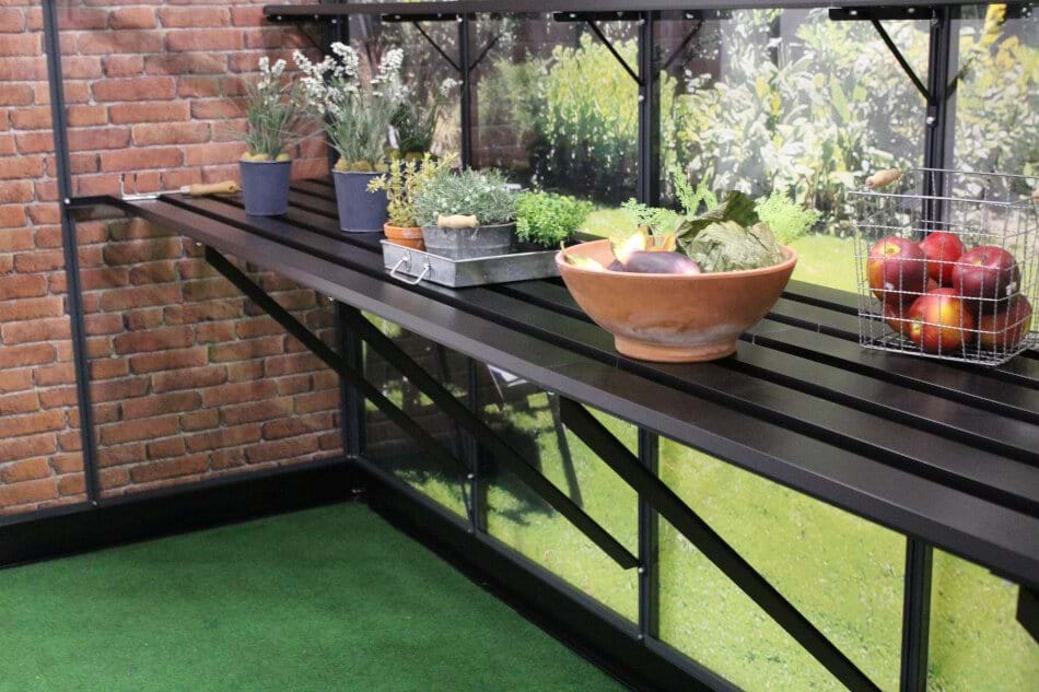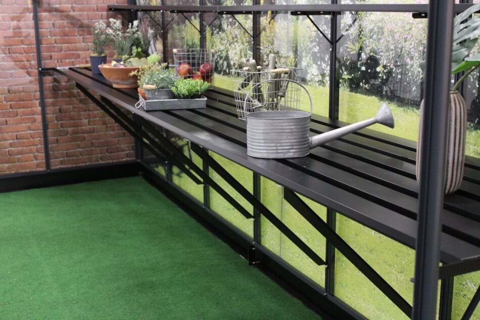 Hvis der i dit drivhus er brug for meget bordplads, så er drivhusbordet med lameller en perfekt løsning. Bordet udnytter hele langsiden i drivhuset ved at gå fra gavl til gavl. Bordet består af seks baner med lameller, der er lavet i sort pulverlakeret aluminium, og som fastgøres på afstivningsprofiler, der nemt monteres i drivhusets tremmer.