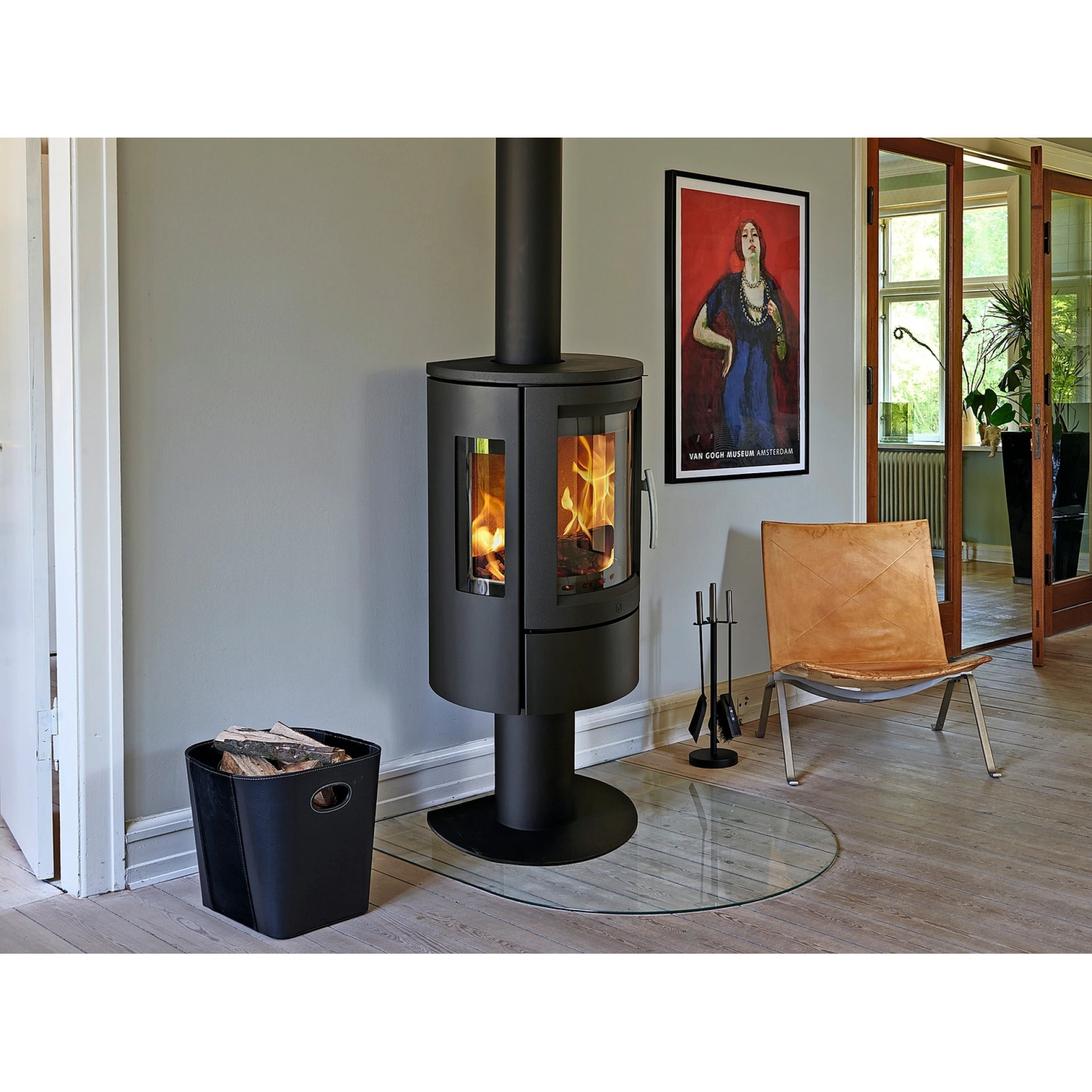 Varde Nice Air brændeovnen har et elegant design med afrundede former og svævende på en piedestal. De buede sideglas og frontglas giver en 180 graders flammeoplevelse, der samtidig spreder hygge og en god varme i rummet.