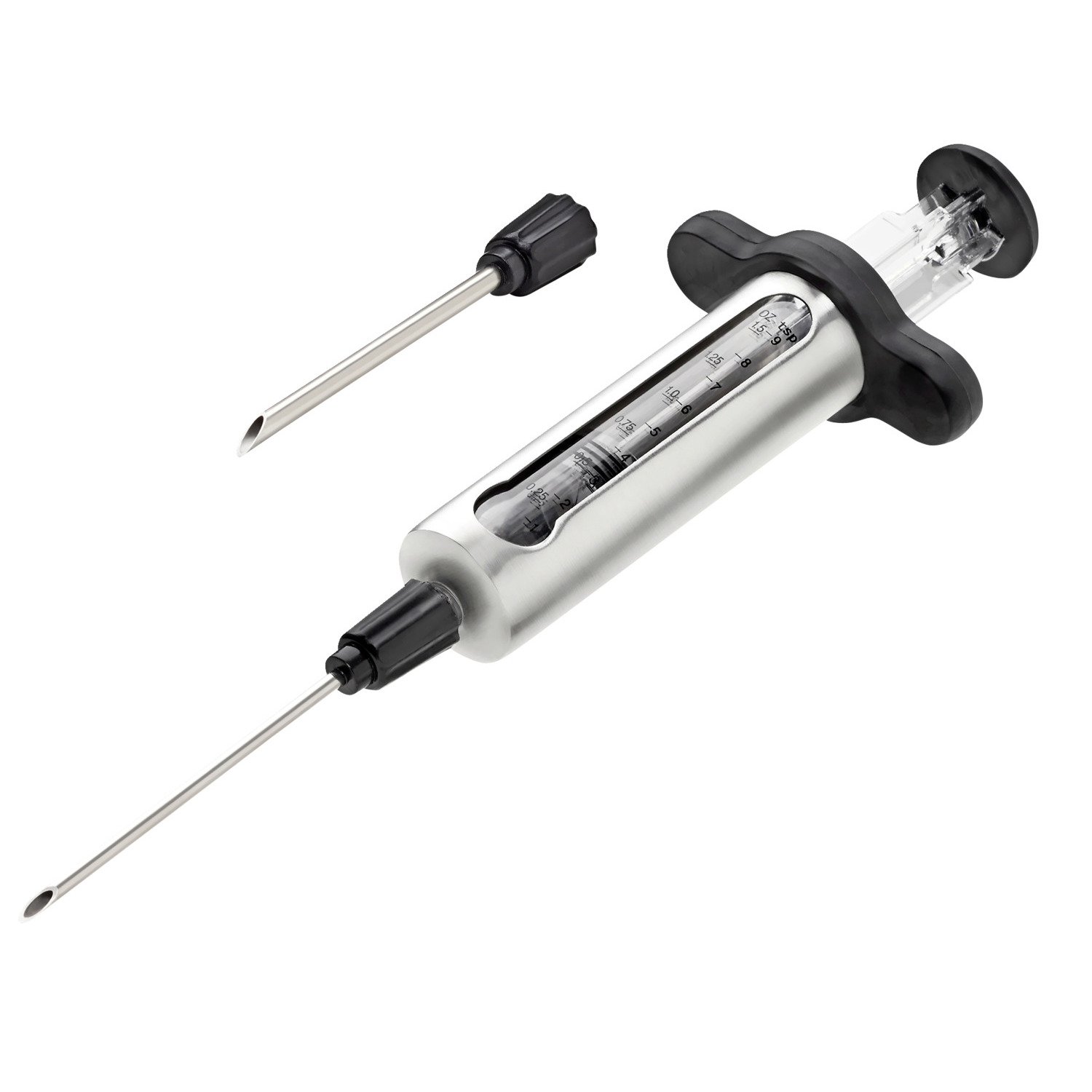 Napoleons marinadebeholder er lavet af rustfrit stål og har et visningsvindue med påtrykte måleenheder, så du nemt kan afmåle den helt rette mængde af marinade. Der er to udskiftelige injektionsnåle, som kan varieres alt efter hvilken type marinade du bruger. Den lille injektionsnål er perfekt til flydende saucer, smør, vin og tynde marinader. Den større injektionsnål er velegnet til fyldig BBQ-sauce eller rustikke marinader med hakkede ingredienser, f.eks. hvidløg og urter.